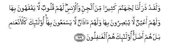7:179 wa laqad dhara’naa li jahannama kathiyram minal jinni wal insi lahum quluubul laa yafqahuuna bihaa wa lahum a’Åyunul laa yubSiruuna bihaa wa lahum aadhaanul laa yasma’UUna bihaa* ulaaika kal an’AAmi balhum aDall* ulaaika humul gaafiluun